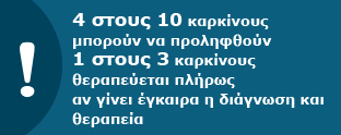 Είναι σημαντικό να θυμάστε ότι, όσο νωρίτερα διαγνωστεί ο καρκίνος, τόσο περισσότερες είναι οι πιθανότητες για ίαση. Ιδίως στην περίπτωση του καρκίνου του μαστού, του καρκίνου του τραχήλου της μήτρας, του καρκίνου του παχέος εντέρου και του καρκίνου του προστάτη υπάρχουν προληπτικές εξετάσεις οι οποίες είναι εξαιρετικά αποτελεσματικές και μπορούν να σώσουν τη ζωή εκατομμυρίων ανθρώπων.