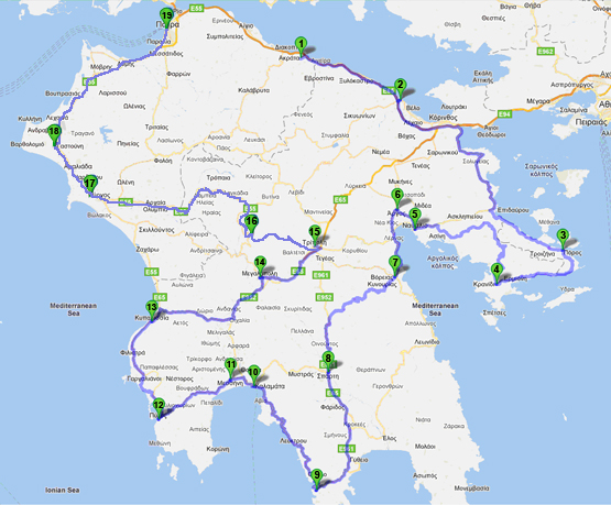 Pylos Messini Kalamata Areopoli Sparti Megalopoli Kuparisia Astros Tripoli Dimitsana Pyrgos Gastouni Patra Akrata Kiato Galatas Argos Nafplio Kranidi