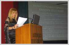 Πρώτη πήρε τον λόγο η κυρία Αρετή Τσερεμέ, μαία του Κέντρου Υγείας Γαστούνης. Η κυρία Τσερεμέ ανέλυσε το Πρόγραμμα του Προσυμπτωματικού Ελέγχου του καρκίνου και την εφαρμογή του από την έναρξή του μέχρι τώρα. Κατόπιν, στο βήμα ανέβηκε ο κύριος Βασίλειος Τσιτσής, Μαιευτήρας-Γυναικολόγος, Επιμελητής Α΄ Γενικού Νοσοκομείου Πύργου, ο οποίος ανέλυσε τη μέθοδο του τεστ ΠΑΠ και εξήγησε πόσο σημαντικό διαγνωστικό εργαλείο είναι για τον προσυμπτωματικό έλεγχο του καρκίνου του τραχήλου της μήτρας. Στη συνέχεια, τον λόγο πήρε ο κ. Σπυρίδων Δημητρακόπουλος, Μαιευτήρας-Γυναικολόγος, Επιμελητής Α΄ Γ. Ν. Πύργου, ο οποίος έκανε αναφορά στα θετικά του εμβολιασμού έναντι του ιού των ανθρωπίνων θηλωμάτων, γνωστό και ως HPV. Τέλος, ο κ. Διονύσιος Αδρακτάς, Ιατρός μίλησε για τη διατροφή και πώς αυτή μπορεί να επηρεάσει θετικά την άμυνα του οργανισμού απέναντι στις αρρώστιες, αλλά και να γίνει ασπίδα προστασίας από τον καρκίνο. Επίσης, ο κύριος Αδρακτάς παρουσίασε στατιστικά στοιχεία που αφορούν σε συλλογή 1.000 δειγμάτων από γυναίκες 20 έως 70 ετών τα οποία λήφθηκαν μεταξύ 1/1/2010 και 1/1/2012 στο Κέντρο Υγείας Γαστούνης. Στην ηλικιακή ομάδα μεταξύ 20 και 30 ετών (147 γυναίκες), μόνο 1 στις 2 έχει φυσιολογικό τεστ ενώ από τα παθολογικά τεστ, το 60% εμφανίζουν φλεγμονή. Τέλος, 1 στις 4 γυναίκες έχει μολυνθεί με τον ιό HPV. Στην ηλικιακή ομάδα μεταξύ 31 και 40 ετών (214 γυναίκες), 70% έχουν φυσιολογικό τεστ ΠΑΠ ενώ από τα παθολογικά, το 80% έχουν φλεγμονή και το 4% έχουν HPV. Επίσης, αυξανόμενης της ηλικίας αυξάνεται και η πιθανότητα για ατυπία (ASCUS). Στην ηλικιακή ομάδα από 41 έως 50 ετών (218 γυναίκες), το 78% έχει φυσιολογικό τεστ ΠΑΠ, το 17% έχουν φλεγμονή ενώ μόνο 1% βρέθηκε να έχει τον ιό HPV. Στις ηλικίες από 51 έως 60 ετών (221 γυναίκες), το συμπέρασμα που εξήχθη ήταν ό,τι σχεδόν 9 στις 10 εμμηνοπαυσιακές γυναίκες έχουν φυσιολογικό τεστ. Τέλος, στις ηλικίες μεταξύ 61 και 70 ετών (200 γυναίκες), το 95,5% έχουν φυσιολογικό τεστ. Για άλλη μια φορά τα στοιχεία αυτά επιβεβαιώνουν τον ισχυρισμό ότι ο καρκίνος μπορεί να προληφθεί εφόσον διαγνωστεί εγκαίρως, γι’ αυτό οι γυναίκες πρέπει να προσέρχονται να κάνουν το τεστ σύμφωνα με τις συστάσεις για κάθε ηλικία.